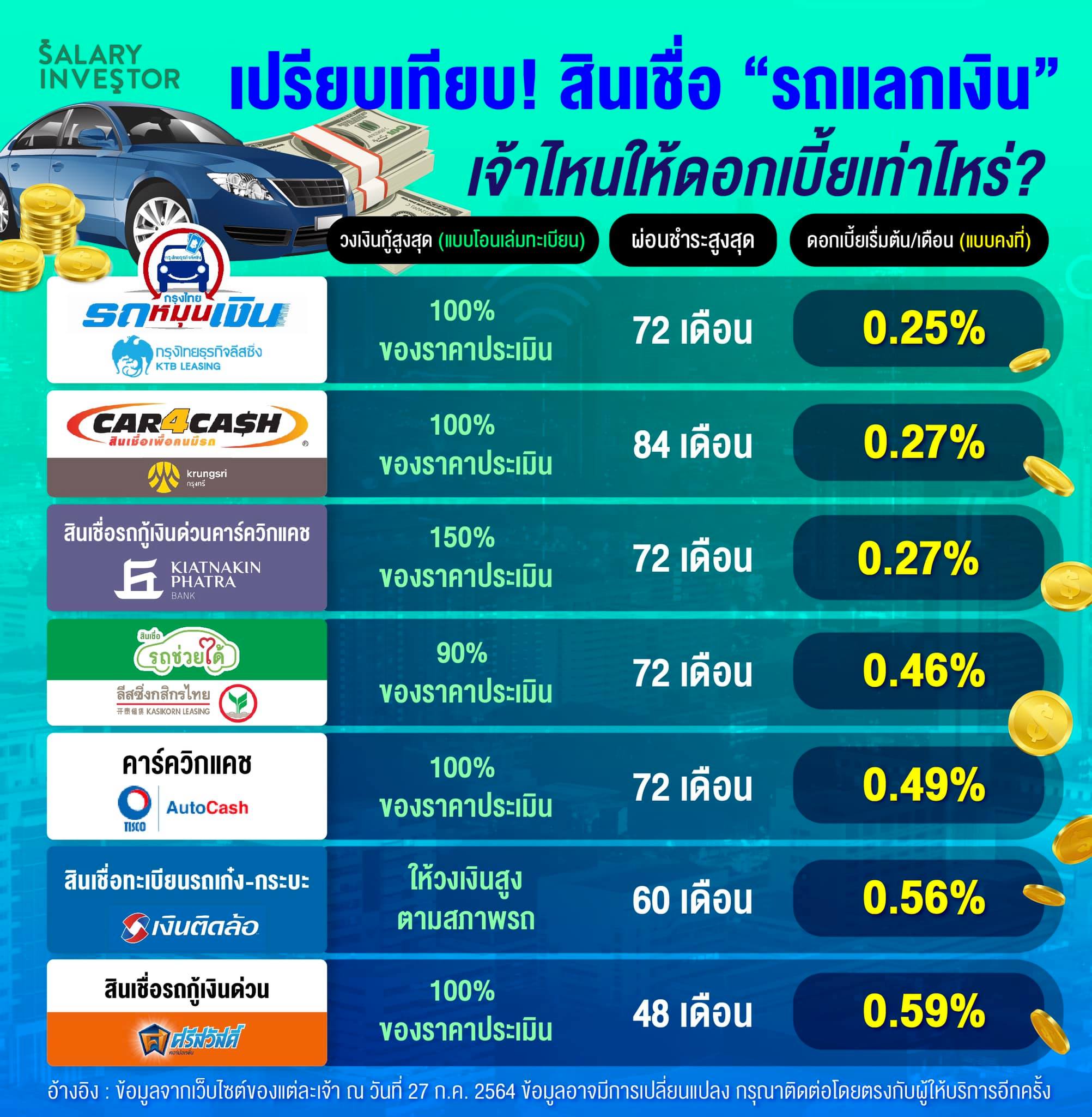 Salary Investor จึงได้รวบรวมโปรโมชั่น ของแต่เจ้าไว้เป็นทางเลือก ให้กับผู้ที่กำลังตัดสินใจที่จะใช้สินเชื่อจำนำทะเบียนรถ