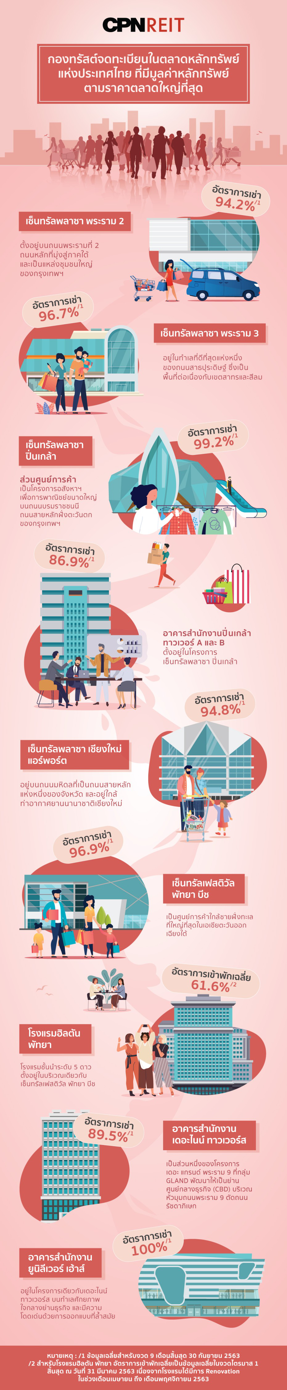 สำหรับนักลงทุนที่กำลังมองหากอง REIT ที่มีโครงการอสังหาฯ คุณภาพบนทำเลแห่งศักยภาพ ต้องมีชื่อของ ‘CPNREIT’ เป็นทางเลือกลำดับต้นๆ เพราะนอกจากเป็นกองทรัสต์ที่มีมูลค่าหลักทรัพย์ตามราคาตลาด (Market Capitalization) ใหญ่ที่สุดในตลาดหลักทรัพย์แห่งประเทศไทยแล้ว CPNREIT ยังมีทรัพย์สินหลายประเภทที่ตั้งอยู่ทั้งในพื้นที่กรุงเทพฯ และต่างจังหวัดที่มีศักยภาพ ซึ่งนับเป็นโอกาสดีที่จะเข้าลงทุนในช่วงนี้ หลังมีการพัฒนาวัคซีนป้องกัน COVID-19 สำเร็จ ส่งผลดีต่อความเชื่อมั่นในการควบคุมโรคระบาดและภาพรวมเศรษฐกิจที่มีโอกาสฟื้นตัว