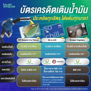 Bank & Saving Credit Card บัตรเครดิตเติมน้ำมัน ประหยัดทุกลิตร ได้แต้มทุกบาท! Bank & SavingCredit Card บัตรเครดิตเติมน้ำมัน ประหยัดทุกลิตร ได้แต้มทุกบาท! By Fresh - Mar 25, 2025 Salary Investor พาดู 3 ค่าย 3 บัตรเครดิตเติมน้ำมันเอาใจคนขับรถเดินทางบ่อย . 1. KTC Bangchak Visa Platinum – รับเครดิตเงินคืน 1% เมื่อเติมน้ำมันที่ปั๊มบางจาก จากยอดชำระไม่เกิน 3,000 บาทต่อเซลล์สลิป จะคืนเข้าบัญชีบัตรเครดิตในเดือนถัดไป สมัครที่นี่ : https://atth.me/go/Lg6dqijU . 2. ttb so chill ปั๊มบางจากทั่วประเทศ : – รับเครดิตเงินคืนสูงสุด 3% เมื่อเติมน้ำมันครบ 600 บาทขึ้นไป / เซลล์สลิป จำกัดเครดิตเงินคืน 18 บาท ต่อครั้ง สูงสุด 4 ครั้ง หรือ 72 บาท ต่อเดือน หรือ สูงสุด 864 บาท ต่อบัญชีบัตรหลักตลอดรายการส่งเสริมการขาย ปั๊มคาลเท็กซ์ทั่วประเทศ : – รับเครดิตเงินคืนสูงสุด 3% เมื่อเติมน้ำมันครบ 700 บาทขึ้นไป / เซลล์สลิป และ รับเครดิตเงินคืนเพิ่มอีก 1% รวมเป็น 4% เมื่อชำระผ่าน CaltexGo – เครดิตเงินคืนสูงสุด 21 บาท / ครั้ง สูงสุด 4 ครั้ง หรือ 84 บาท / เดือน หรือสูงสุด 1,008 บาท / บัญชีบัตรหลัก ตลอดรายการส่งเสริมการขาย – ทุกการใช้จ่าย 20 บาท รับ 1 คะแนน ตั้งแต่วันที่ 1 มกราคม – 31 ธันวาคม 2568 สมัครที่นี่ : https://atth.me/007bpm0025ur นอกเหนือจากบัตรเครดิต ttb so chill ที่ได้โปรนี้ยังมีบัตรเครดิต ttb Global House, ttb so fast, ttb so smart และ ttb absolute ที่ได้รับโปรบัตรเติมน้ำมันแบบเดียวกัน . 3. Krungsri Signature – รับเครดิตเงินคืน 3% ปั๊มบางจาก และ ปั๊มเอสโซ่ (เดิม) *จำกัดการคำนวณรายการเครดิตเงืนคืนสำหรับยอดการเติมน้ำมันสูงสุด 4,800 บาท/หมายเลขบัญชีบัตรหลัก/รอบบัญชี สมัครที่นี่ : https://atth.me/00dayr0025ur . หมายเหตุ : *ข้อมูลอาจมีการเปลี่ยนแปลงโปรดดูข้อมูลจากเว็ปไซต์ของผู้ให้บริการเพิ่มเติม *ใช้เท่าที่จำเป็นและชำระคืนได้เต็มจำนวนตามกำหนด จะได้ไม่เสียดอกเบี้ย 16% ต่อปี RELATED ARTICLESMORE FROM AUTHOR Credit Card อิ่มคุ้มกับบุฟเฟต์ที่ COPPER ฟรี เพียงสมัครบัตรเครดิต UOB Credit Card บัตรเครดิต Privimiles ตอบโจทย์คนรักการเดินทาง Credit Card บัตรเครดิตสำหรับคนเงินเดือน 30,000 บาท ใบไหนได้สิทธิประโยชน์เพียบ Advertisment