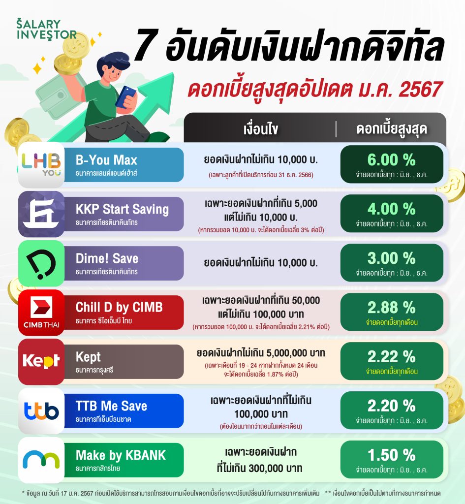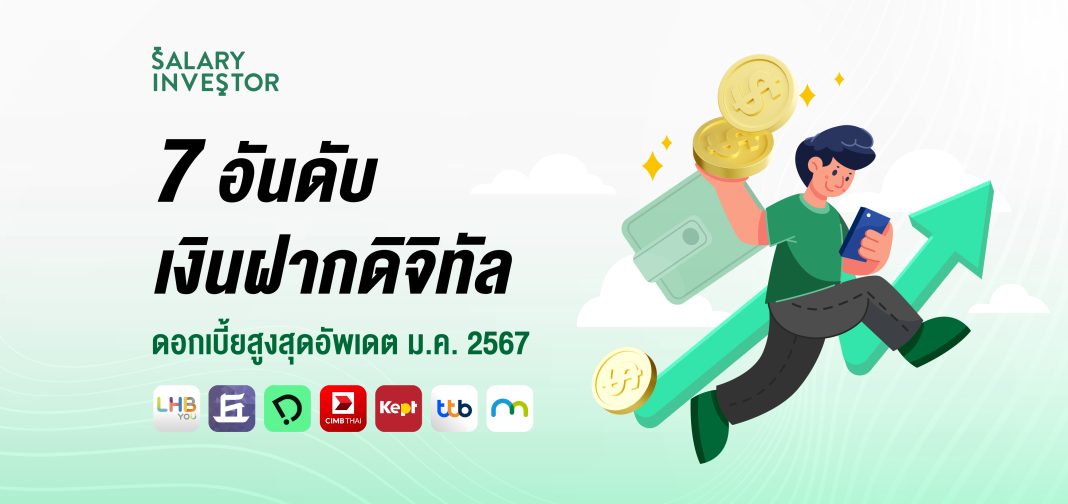 วันนี้ Salary Investor ได้รวบรวม 7 บัญชีเงินฝากดิจิทัลที่ดอกเบี้ยสูง อัปเดตปี 2567 มีอะไรบ้าง ไปดูกัน!