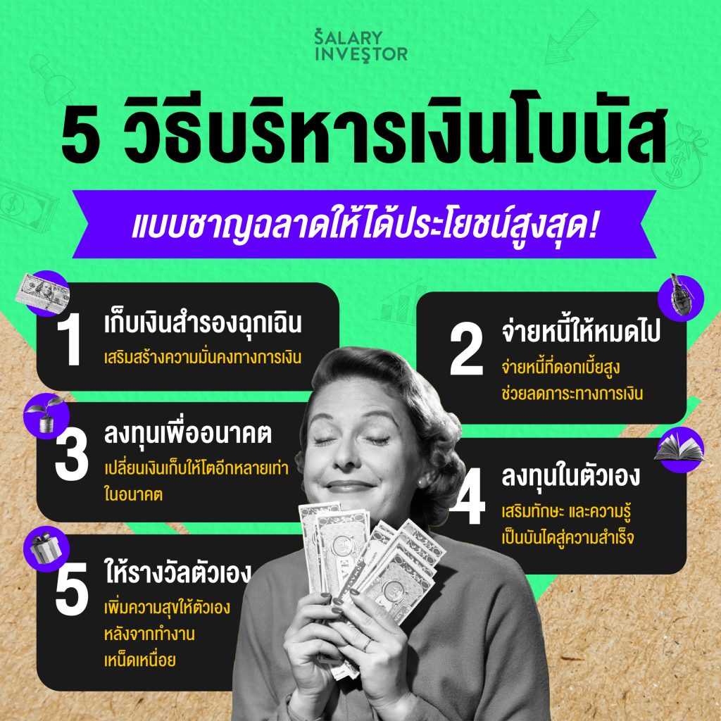 วันนี้ Salary Investor จึงได้รวบรวม 5 วิธีการบริหาร “เงินโบนัส” อย่างชาญฉลาดเพื่อเติบเต็มทุกเป้าหมายในชีวิต ให้กลายเป็นจริงได้มาให้แล้ว!