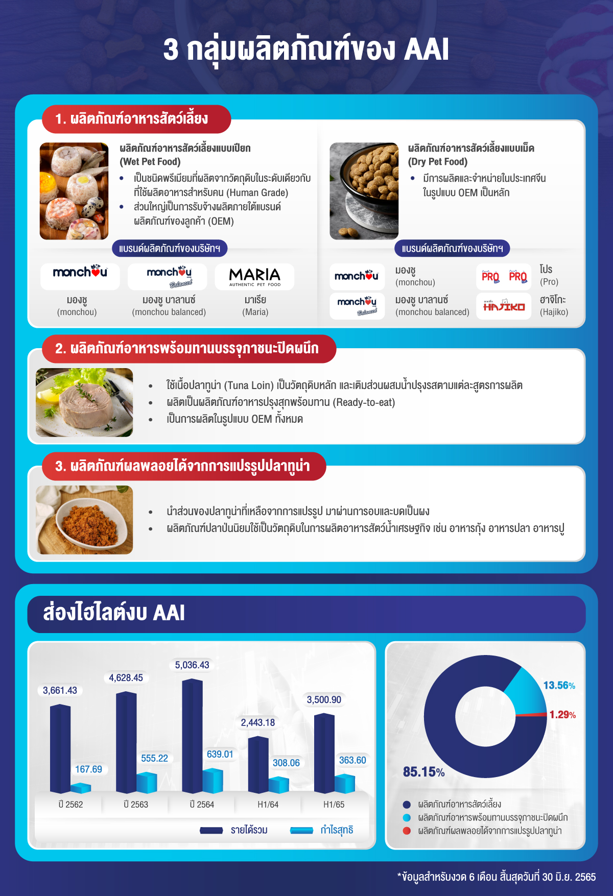 AAI เป็นหนึ่งในผู้รับจ้างผลิตอาหารสัตว์เลี้ยงแบบเปียกและอาหารพร้อมทานบรรจุภาชนะปิดผนึก โดยอยู่ในอุตสาหกรรมมานานกว่า 15 ปี จนเป็นที่ยอมรับจากลูกค้าทั้งเจ้าของแบรนด์ผลิตภัณฑ์และผู้บริโภคในระดับสากล ปัจจุบัน AAI มีผลิตภัณฑ์แบ่งเป็น 3กลุ่มหลัก ได้แก่ ผลิตภัณฑ์อาหารสัตว์เลี้ยง (Pet Food) สำหรับสุนัขและแมว ผลิตภัณฑ์อาหารพร้อมทานบรรจุภาชนะปิดผนึก (Human Food) และผลิตภัณฑ์ผลพลอยได้ที่ได้จากการแปรรูปปลาทูน่า