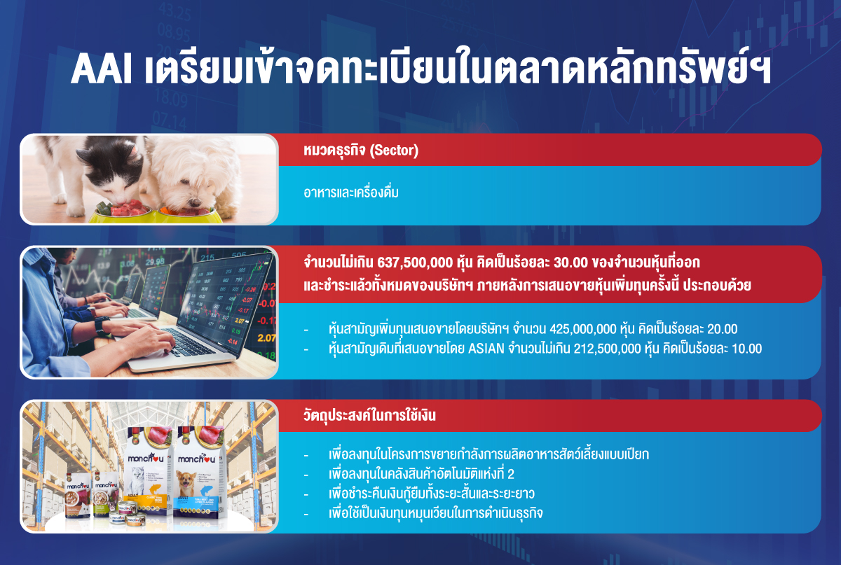 เร็ว ๆ นี้ กำลังจะมีหุ้นน้องใหม่ที่ทำธุรกิจอาหารสัตว์เลี้ยง เข้าจดทะเบียนในตลาดหลักทรัพย์แห่งประเทศไทยคือ บมจ. เอเชี่ยน อะไลอันซ์ อินเตอร์เนชั่นแนล หรือ AAI ผู้ผลิตและจำหน่ายอาหารสัตว์เลี้ยงแบบเปียกรายใหญ่ของไทย และถือเป็นบริษัท Flagship ในธุรกิจอาหารสัตว์เลี้ยง ในกลุ่ม บมจ. เอเชี่ยนซี คอร์ปอเรชั่น หรือ ASIAN ผู้ประกอบธุรกิจจำหน่ายและส่งออกผลิตภัณฑ์อาหารแช่เยือกแข็ง อาหารสัตว์เลี้ยง ทูน่า และอาหารสัตว์น้ำ
