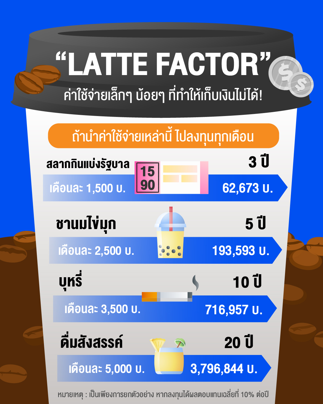 ถ้าเราลองนำค่าใช้จ่ายนี้ในแต่ละเดือนมารวมกันอาจจะเป็นเงินก้อนใหญ่ ที่เราคาดไม่ถึง ซึ่งไม่ใช่แค่กาแฟอย่างเดียว ยังหมายถึงค่าใช้จ่ายเล็ก ๆ น้อย ๆ อื่น ๆ