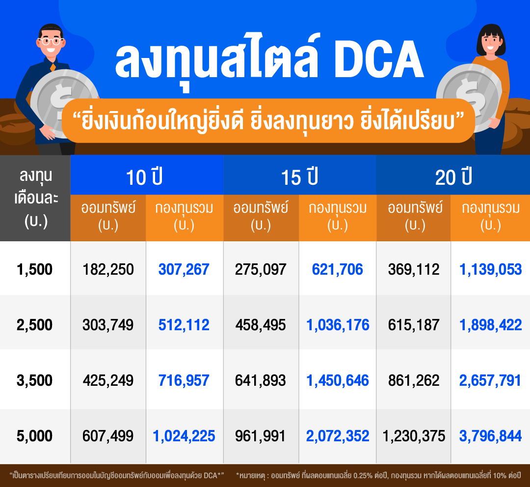 การออมผ่านการลงทุนสไตล์  “DCA” เป็นการลงทุนที่เน้นวินัย และระยะเวลาในการลงทุน เป็นหลักสำคัญ “ยิ่งเงินก้อนใหญ่ยิ่งดี ยิ่งลงทุนยาว ยิ่งได้เปรียบ” ที่สำคัญคือต้องเลือกนำเงินไปวางให้ถูกที่ด้วย เพื่อให้ได้รับผลตอบแทนเต็มเม็ดเต็มหน่วย
