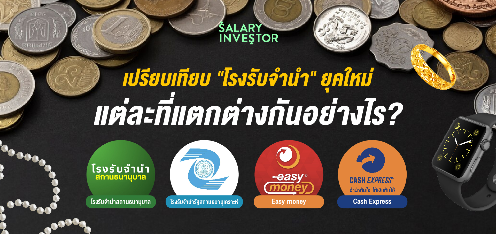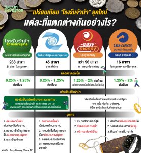Guide Financial Planing เปรียบเทียบ “โรงรับจำนำ”ยุคใหม่ แต่ละที่แตกต่างกันอย่างไร? GuideFinancial Planing เปรียบเทียบ “โรงรับจำนำ”ยุคใหม่ แต่ละที่แตกต่างกันอย่างไร? By Fresh - Oct 21, 2024 ในยุคนี้มีโรงรับจำนำไหนบ้างนะ? แล้วแต่ละที่แตกต่างกันอย่างไร? วันนี้ Salary Investor พาเปรียบเทียบโรงรับจำนำ 4 เจ้าช่วยตอบโจทย์เพื่อน ๆ ที่กำลังหาสถานที่จำนำ 1. โรงรับจำนำสถานธนานุบาล เป็นโรงรับจำนำภายใต้การดูแลขององค์กรปกครองส่วนท้องถิ่นเพื่อเป็นการช่วยเหลือประชาชนที่เดือดร้อนและยากจน ไม่ต้องไปกู้ยืมเงินจากเอกชน เริ่มก่อตั้งเมื่อปี 2503 เป็นเวลากว่า 64 ปี รูปแบบการดำเนินการ โดยกรุงเทพมหานครหรือเทศบาลส่วนท้องถิ่นในแต่ละพื้นที่ เงินทุนหมุนเวียนมาจากกองทุนส่งเสริมกิจการเทศบาล และเงินกู้จากกองทุนส่งเสริมกิจการเทศบาล จำนวนสาขา/เวลาทำการ : มีสาขาจำนวนทั้งหมด 21 สาขา ในกรุงเทพฯ และรวมทั้งหมดกว่า 238 แห่งทั่วไทย เปิดทำการวันจันทร์ – ศุกร์ เวลา 08.00 – 16.00 น.(ไม่พักเที่ยง) อัตราดอกเบี้ย : – เงินต้นไม่เกิน 5,000 บาท คิดอัตราดอกเบี้ย 0.25 % ต่อเดือน – เงินต้น 5,001 – 15,000 บาท คิดอัตราดอกเบี้ย 1.00 % ต่อเดือน – เงินต้นเกิน 15,000 บาท คิดอัตราดอกเบี้ยเงินต้น 2,000 บาทแรก 2 % และส่วนที่เกิน 2,000 บาท คิดอัตราดอกเบี้ย 1.25 % ต่อเดือน ทรัพย์สินที่รับจำนำ : ทอง เพชร นาก เงิน นาฬิกา แว่นตา เครื่องใช้ไฟฟ้า เครื่องมือช่าง และของใช้เบ็ดเตล็ด ต้องไม่เป็นทรัพย์สินของทางราชการ จุดเด่น : 1. อัตราดอกเบี้ยต่ำ เน้นช่วยเหลือประชาชน 2. ความน่าเชื่อถือสูง เพราะเป็นหน่วยงานของรัฐบาล 3. กฎระเบียบชัดเจน ได้รับการกำกับดูแลจากรัฐ ทำให้มีมาตรฐานที่ชัดเจน 2. โรงรับจำนำรัฐสถานธนานุเคราะห์ โรงรับจำนำเพื่อสังคม ก่อตั้งเมื่อปี 2498 ในสมัยจอมพล ป. พิบูลสงคราม ดำรงตำแหน่งนายก เป็นระยะเวลากว่า 69 ปี โรงรับจำนำที่ทำการยาวนานที่สุดในไทย รูปแบบการดำเนินการ : โดยกรมประชาสงเคราะห์ เงินงบประมาณจากรัฐบาลและ เงินทุนหมุนเวียนมาจากการกู้เงินจากธนาคารออมสิน จำนวนสาขา/เวลาทำการ : มีสาขาจำนวนทั้งหมด 45 สาขาทั่วไทย เปิดทำการวันจันทร์ – ศุกร์ ตั้งแต่เวลา 08.00 – 16.30 น. (ไม่พักเที่ยง) อัตราดอกเบี้ย : – เงินต้นไม่เกิน 5,000 บาท คิดอัตราดอกเบี้ย 0.25 % ต่อเดือน – เงินต้น 5,001 บาท แต่ไม่เกิน 10,000 บาท คิดอัตราดอกเบี้ย 0.75 % ต่อเดือน – เงินต้น 10,001 บาท แต่ไม่เกิน 20,000 บาท คิดอัตราดอกเบี้ย 1.00 % ต่อเดือน – เงินต้น 20,001 บาท แต่ไม่เกิน 100,000 บาท คิดอัตราดอกเบี้ย 1.25 % ต่อเดือน ทรัพย์สินที่รับจำนำ : ทอง เพชร นาก เงิน นาฬิกา แว่นตา เครื่องใช้ไฟฟ้า เครื่องมือช่าง และของใช้เบ็ดเตล็ด ต้องไม่เป็นทรัพย์สินของทางราชการ จุดเด่น : 1. อัตราดอ