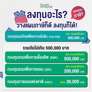 Guide Financial Planing ลงทุนอะไรได้ลดหย่อนภาษี? วางแผนภาษีก็ดี ลงทุนก็ได้! GuideFinancial Planing ลงทุนอะไรได้ลดหย่อนภาษี? วางแผนภาษีก็ดี ลงทุนก็ได้! By Fresh - Sep 12, 2024 อยากลดหย่อนภาษีและวางแผนเกษียณไปพร้อมกันไหม? การลงทุนกองทุนรวมเกษียณจะเป็นอีกหนึ่งตัวช่วย เพราะ นอกจากจะช่วยลดหย่อนภาษีได้แล้วยังเป็นการเก็บเงินไปในตัวอีกด้วย วันนี้ Salary Investor มาแนะนำกองทุนลดหย่อนภาษีสำหรับเพื่อน ๆ สายออมและลงทุนทุกคนสามารถลดหย่อนภาษีได้สูงสุดถึง 500,000 บาท จะมีอะไรบ้าง..ไปดูกันเลย 1. กองทุนรวมไทยเพื่อความยั่งยืน (Thai ESG) เน้นลงทุนในบริษัทจดทะเบียนในประเทศไทยที่มีการดำเนินธุรกิจคำนึงถึงปัจจัยด้านสิ่งแวดล้อม (Environmental) สังคม (Social) และการกำกับดูแลกิจการที่ดี (Governance) เพื่อส่งเสริมการเติบโตทางเศรษฐกิจที่ยั่งยืนของประเทศไทย เป็นกองทุนรวมล่าสุดที่ให้รับการลดหย่อนเต็ม ๆ โดยไม่รวมกับกลุ่มการลงทุนอื่น ๆ ลดหย่อนภาษีได้ 30% ของเงินได้ที่ต้องเสียภาษีตามที่จ่ายจริง สูงสุดไม่เกิน 300,000 บาท 2. กองทุนรวมเพื่อการเลี้ยงชีพ (RMF : Retirement Mutual Fund) ส่งเสริมการออมเงินในระยะยาวเพื่อใช้จ่ายในช่วงเกษียณอายุ – ไม่กำหนดเงินลงทุนขั้นต่ำ – ต้องลงทุนต่อเนื่องใน RMF ทุกปี เว้นได้ไม่เกิน 1 ปี และ ถือหน่วยลงทุนใน RMF ไม่น้อยกว่า 5 ปี นับตั้งแต่วันที่ซื้อครั้งแรก และ มีอายุครบ 55 ปีบริบูรณ์ถึงจะขายคืนกองทุนได้ สับเปลี่ยนได้เฉพาะกองทุน RMF ด้วยกันเท่านั้น ลดหย่อนภาษีได้ 30% ของเงินได้ที่ต้องเสียภาษีตามที่จ่ายจริง สูงสุดไม่เกิน 500,000 บาท 3. กองทุนรวมเพื่อการออม (SSF : Super Saving Funds) เป็นกองทุนรวมเพื่อส่งเสริมการออมระยะยาว – ไม่กำหนดเงินลงทุนขั้นต่ำ – ไม่จำเป็นต้องลงทุนต่อเนื่องทุกปี แต่ต้องถือหน่วยลงทุนใน SSF อย่างน้อย 10 ปีนับจากวันที่ซื้อกองทุนรวม SSF สับเปลี่ยนได้เฉพาะระหว่างกองทุน SSF เท่านั้น ลดหย่อนภาษีได้ 30% ของเงินได้ที่ต้องเสียภาษีตามที่จ่ายจริงสูงสุดไม่เกิน 200,000 บาท 4. กองทุนการออมแห่งชาติ (กอช.) กองทุนที่รัฐจัดตั้งขึ้นเพื่อส่งเสริมให้ประชาชน อายุตั้งแต่ 15 ปีขึ้นไป โดยเฉพาะกลุ่มแรงงานนอกระบบมีโอกาสออมเงินเพื่อใช้จ่ายในยามเกษียณ และ ภาครัฐร่วมสมทบเงินออมให้ด้วยช่วยสร้างหลักประกันทางการเงินในระยะยาว ให้กับผู้ที่ไม่มีสวัสดิการบำนาญจากที่ทำงาน ลดหย่อนภาษีตามที่จ่ายจริง สูงสุดไม่เกิน 30,000 บาท *** สำหรับกลุ่มค่าลดหย่อนการลงทุนได้แก่ กองทุน RMF, กองทุน SSF, กบข.,กองทุนสำรองเลี้ยงชีพ, กองทุนสงเคราะห์ครูเอกชน,กองทุนการออมแห่งชาติ และ ประกันชีวิตแบบบำนาญ เมื่อรวมกันทั้งหมด ต้องไม่เกิน 500,000 บาท *** ทั้งหมดนี้คือ กองทุนรวมที่เป็นทางเลือกให้เพื