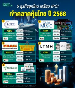 Guide Investment 5 ธุรกิจยุคใหม่ เตรียม IPO! เข้าตลาดหุ้นไทย ปี 2568 GuideInvestment 5 ธุรกิจยุคใหม่ เตรียม IPO! เข้าตลาดหุ้นไทย ปี 2568 By Salary Investor - Jan 27, 2025 แม้หุ้น IPO ในตลาดหลักทรัพย์ไทยปี 2567 ที่ผ่านมาจะเห็นราคาลงและไม่ได้ทำตลาดหวือหวาอย่างที่ควร แต่ในปี 2568 นี้มีความหวังว่าตลาดจะกลับมาสดใสขึ้น ด้วยรายชื่อหุ้น IPO ที่น่าสนใจ พร้อมรับธุรกิจใหม่ ๆ เข้าตลาด . วันนี้ Salary Investor พาดู 5 บริษัทที่จะ IPO ปี 2568 ทั้งตัวที่ได้รับอนุญาตแบบคำขอให้เสนอขายหลักทรัพย์ที่ออกใหม่แล้ว และ ยื่นแบบต่อ ก.ล.ต. ทั้งในตลาดหลักทรัพย์ SET และ mai จะมีอะไรบ้าง ไปดูกันเลย . 1. ACPG บริษัท อัลฟาแคปปิตอล พาร์ทเนอร์ส กรุ๊ป จำกัด (มหาชน) บริษัทบริหารสินทรัพย์ที่มีหลักประกันจากภาคเอกชนที่มีขนาดใหญ่ที่สุดในประเทศไทย โดยมีธุรกิจหลักคือการบริหารจัดการสินทรัพย์ด้อยคุณภาพ (NPL) และทรัพย์สินรอการขาย (NPA) ดำเนินการโดยบริษัทย่อยซึ่งได้รับใบอนุญาตประกอบธุรกิจบริหารสินทรัพย์ และอยู่ภายใต้การกำกับดูแลของ ธปท. . 2. GMM บริษัท จีเอ็มเอ็ม มิวสิค จำกัด (มหาชน) เน้นธุรกิจด้านเพลงโดยเฉพาะ (Music Pure Play) ที่ดำเนินธุรกิจตั้งแต่การคัดเลือกและพัฒนาศิลปิน การผลิตผลงานเพลง และการจัดงานคอนเสิร์ตและเทศกาลดนตรี ตลอดจนการบริหารค่ายเพลงและการทำการตลาดในรูปแบบต่าง ๆ โดยเป็นบริษัทในกลุ่มบมจ. จีเอ็มเอ็ม แกรมมี่ (GRAMMY) . 3. MRDIYT บริษัท มิสเตอร์. ดี.ไอ.วาย. โฮลดิ้ง (ประเทศไทย) ร้านที่หลายคนคุ้นเคยในการซื้อของใช้เข้าบ้าน หรือ อุปกรณ์ต่าง ๆ ก็มีให้เลือกซื้อ ครบครันด้วยราคาถูก เป็นธุรกิจถือหุ้นในบริษัทอื่น (Holding Company) ที่ประกอบธุรกิจค้าปลีกสินค้าประเภทอุปกรณ์ตกแต่งบ้านและสินค้าไลฟ์สไตล์ . 4. LTMH บริษัท แอลทีเอ็มเอช จำกัด (มหาชน) เพจสื่อการเงิน-การลงทุนเจ้าดังอย่าง “ลงทุนแมน” โดยแบ่งธุรกิจเป็น 2 กลุ่ม ดังนี้ 1) ธุรกิจสื่อและแพลตฟอร์มสื่อ ออนไลน์ ได้แก่ สื่อออนไลน์ แพลตฟอร์มสื่อออนไลน์ และ ให้บริการทีปรึกษาด้านการตลาดออนไลน์แบบครบวงจร 2) ธุรกิจออฟไลน์ ได้แก่ จัดงานอีเวนต์ ขายหนังสือ . 5. SKILL บริษัท สกิลเลน เทคโนโลยี จำกัด (มหาชน) บริษัทชั้นนำด้านเทคโนโลยีการศึกษา (EdTech) ของประเทศไทย ที่มุ่งมั่นในการพัฒนานวัตกรรมเพื่อการเรียนรู้ตลอดชีวิต ผ่านแพลตฟอร์มเรียนออนไลน์ที่ครบวงจร (1.1) แพลตฟอร์มเรียนออนไลน์สำหรับบุคคลทั่วไป (1.2) แพลตฟอร์มเรียนออนไลน์สำหรับองค์กร และ (1.3) แพลตฟอร์มเรียนออนไลน์สำหรับปริญญาออนไลน์ และมีธุรกิจให้คำปรึกษาและพัฒนานวัตกรรมด้านการศึกษา . . หมายเหตุ : **การลงทุนมีความเสี่ยง ผู้ลงทุนควรศึกษาข้อมูลก่อนตัดสินใจลงทุน** RELATED ARTICLESMORE FROM AUTHOR Investment THE 8EIGHT MULTIVERSE แคมเปญกล่องสุ่ม 