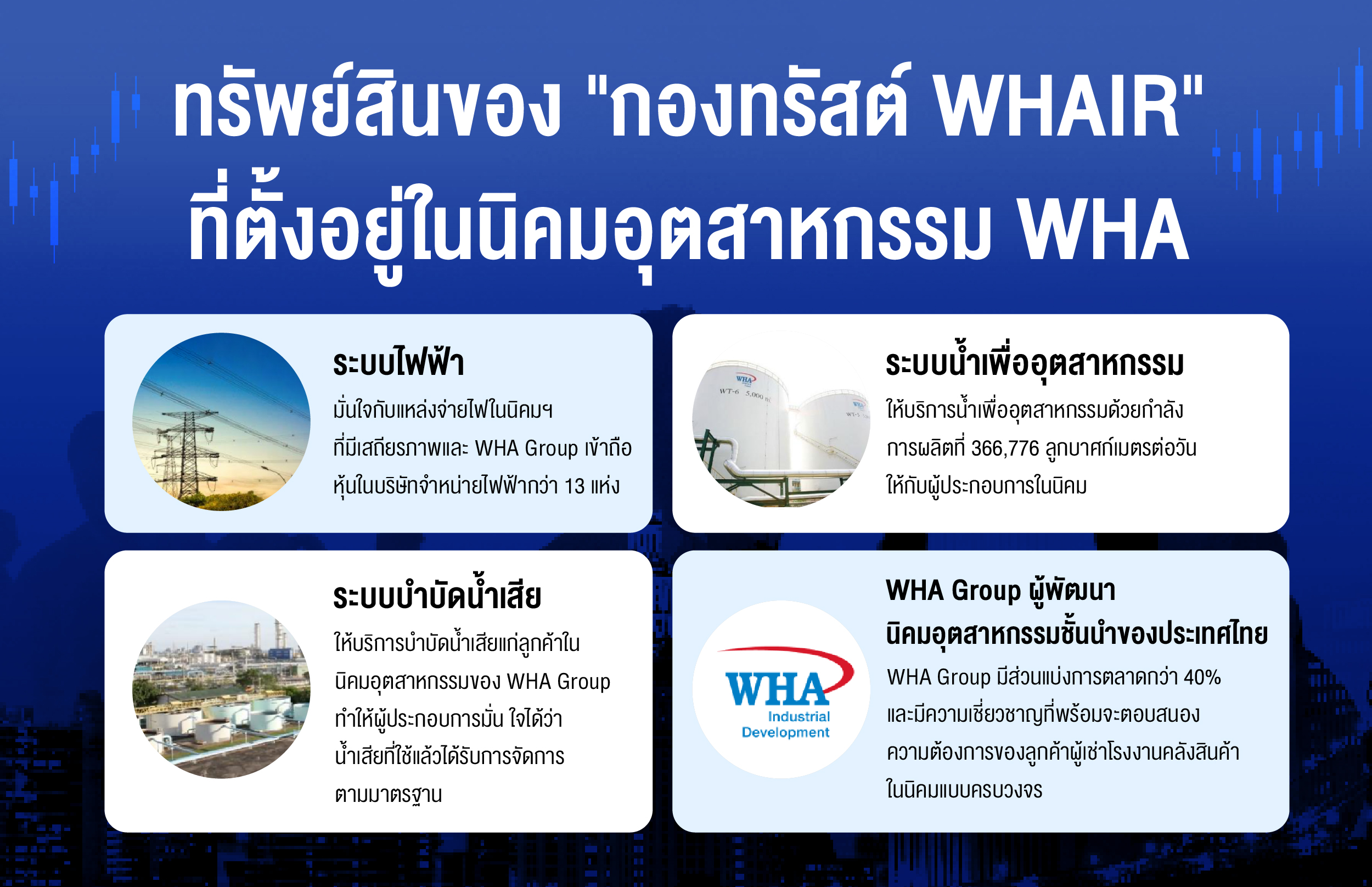 “WHAIR” หรือ ทรัสต์เพื่อการลงทุนในสิทธิการเช่าอสังหาริมทรัพย์ดับบลิวเอชเอ อินดัสเตรียล (WHA Industrial Leasehold Real Estate Investment Trust) หรือกองทรัสต์ “WHAIR” ลงทุนในสิทธิการเช่าในโรงงานและคลังสินค้าสำเร็จรูปคุณภาพสูง ในบริเวณอีสเทิร์นซีบอร์ด ซึ่งเป็นจุดยุทธศาสตร์สำคัญของอุตสาหกรรมและการขนส่งของประเทศไทยและภูมิภาคอาเซียน และเป็นเขตพัฒนาพิเศษภาคตะวันออก (EEC) โดยทรัพย์สินที่กอง WHAIR ลงทุนตั้งอยู่ในนิคมอุตสาหกรรม WHA จึงสามารถดึงดูดผู้เช่าที่ต้องการประกอบธุรกิจภายในคลัสเตอร์ของธุรกิจภายในนิคมอุตสาหกรรมของ WHA Group
