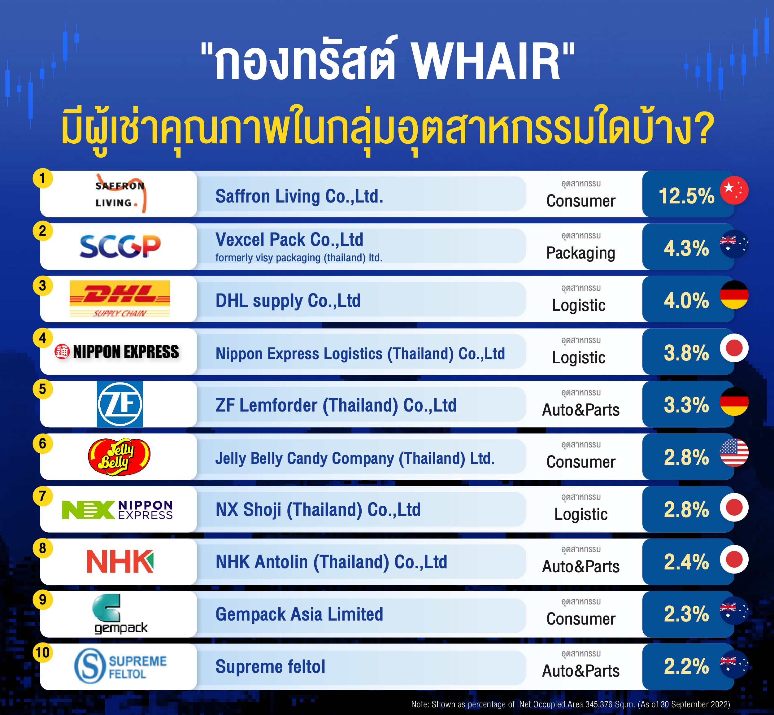 กองทรัสต์ WHAIR มีผู้เช่าคุณภาพในกลุ่มอุตสาหกรรมใดบ้าง?