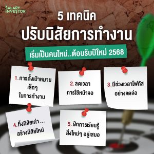 Guide Self Improvement 5 เทคนิค ปรับนิสัยการทำงาน เริ่มเป็นคนใหม่..ต้อนรับปีใหม่ 2568 GuideSelf Improvement 5 เทคนิค ปรับนิสัยการทำงาน เริ่มเป็นคนใหม่..ต้อนรับปีใหม่ 2568 By Fresh - Dec 3, 2024 ช่วงนี้ก็เป็นช่วงสิ้นปี 2567 แล้ว การทบทวนเรื่องราวในปีที่ผ่านมาจากนั้นนำมาปรับปรุงแก้ไข พัฒนาตนเองก็เป็นสิ่งที่ดี และ ทำให้เราพัฒนาได้อย่างก้าวกระโดด โดยเฉพาะในเรื่องของการทำงาน . วันนี้ Salary Investor มาแชร์ 5 เทคนิค ที่จะช่วยให้เพื่อน ๆ ปรับนิสัยการทำงาน ช่วยพัฒนาสกิลการทำงานได้อย่างยั่งยืน จะมีเทคนิคอะไรบ้าง มาดูกัน . 1. การตั้งเป้าหมายเล็ก ๆ ในการทำงาน เริ่มจากเป้าหมายที่ทำได้จริง ไม่ใหญ่จนเกินไป โดยการทำ To do list ในแต่ละวัน เป็นต้น พอจบวัน หากเราทำได้ตามเป้าหมายที่วางไว้จะเป็นการสร้างความรู้สึกถึงความสำเร็จในระยะสั้น และ ช่วยสร้างแรงจูงใจให้ตัวเอง นอกจากนี้อาจเป็นการให้รางวัลตัวเองเล็ก ๆ น้อย ๆ เมื่อทำงานบางอย่างที่ตึงเครียดมานานแล้วลุล่วงได้สำเร็จก็เป็นการเติมกำลังใจให้ตัวเองอย่างหนึ่ง . 2. ลดเวลาการใช้หน้าจอ ในที่นี้จะหมายถึง ทุกหน้าจอ ไม่ว่าจะเป็นโทรศัพท์ คอมพิวเตอร์ หรือ แท็บเล็ต เพราะ การใช้หน้าจอมากเกินไป จะส่งผลเสียทั้งสุขภาพกาย และ สุขภาพจิต อาจทำให้ปวดตา ปวดคอ ปวดหลัง จนไปถึงอาการทางจิตต่าง ๆ เวลาทำงานเราใช้หน้าจอหลายชั่วโมงติดต่อกันมากเพียงพอแล้ว ดังนั้น นอกเหนือจากเวลางานก็ลดการใช้โซเชียล และ ไม่เช็คอีเมลล์ เพื่อให้เวลาตัวเองได้พักสมอง พักสายตาบ้าง หากใครที่เลี่ยงไม่ได้ ในตอนระหว่างทำงานก็สลับเป็นมองหน้าต่าง มองวิว ธรรมชาติ 20 วินาที และ ทำงานต่อ 20 นาที หรือหลับตา 5 นาทีก็ได้ตามที่ผู้เชี่ยวชาญแนะนำ รวมถึงการปรับอิริยาบถท่านั่งทำงานให้ถูกต้องอยู่เสมอ . 3. มีช่วงเวลาโฟกัสอย่างจดจ่อ สมัยนี้มีปัจจัยต่าง ๆ มากมายมารบกวนการทำงานมากขึ้น และ ทำให้เราหลุดโฟกัสกับการทำงานได้บ่อยมากกว่าเดิม ดังนั้น เราจึงควรมีช่วงเวลาแห่งการ Deep Focus ตั้งใจทำงานอย่างจดจ่อ สามารถทำได้หลายวิธี เช่น – ตั้งเวลาโฟกัส 25 นาที แล้วทำงานอย่างเต็มที่ จากนั้นพักสั้นๆ 5 นาที ทำซ้ำ 4 รอบแล้วพักยาว 15-30 นาที – กำหนดช่วงเวลาโฟกัส เลือกเวลาที่เหมาะสมที่สุดในแต่ละวัน.ในการโฟกัสกับการทำงาน เช่น ช่วงเช้าหรือบ่ายที่คุณมีพลังและสมาธิสูง – จัดพื้นที่ทำงานให้ปราศจากสิ่งรบกวน อย่างการปิดการแจ้งเตือนจากโทรศัพท์หรือแอปพลิเคชันต่างๆ และ ใช้หูฟังป้องกันเสียงรบกวนถ้าจำเป็น – ใช้เทคนิคการหายใจหรือสมาธิ ก่อนเริ่มงาน ลองทำสมาธิหรือหายใจลึกๆ เพื่อให้สมองผ่อนคลาย วิธีนี้ช่วยเตรียมจิตใจให้พร้อมโ