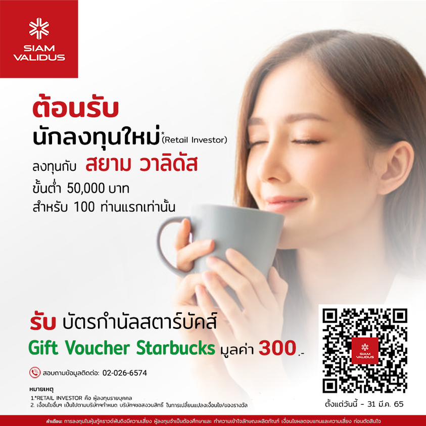 แคมเปญต้อนรับสมาชิกนักลงทุนใหม่ 100 ท่านแรกที่เข้าร่วมลงทุนกับเรา ขั้นต่ำ 50,000 บาท รับไปเลย Gift Voucher จาก Starbucks มูลค่า 300 บาท ตั้งแต่วันนี้ – 31 มีนาคม 2565 นี้เท่านั้น!