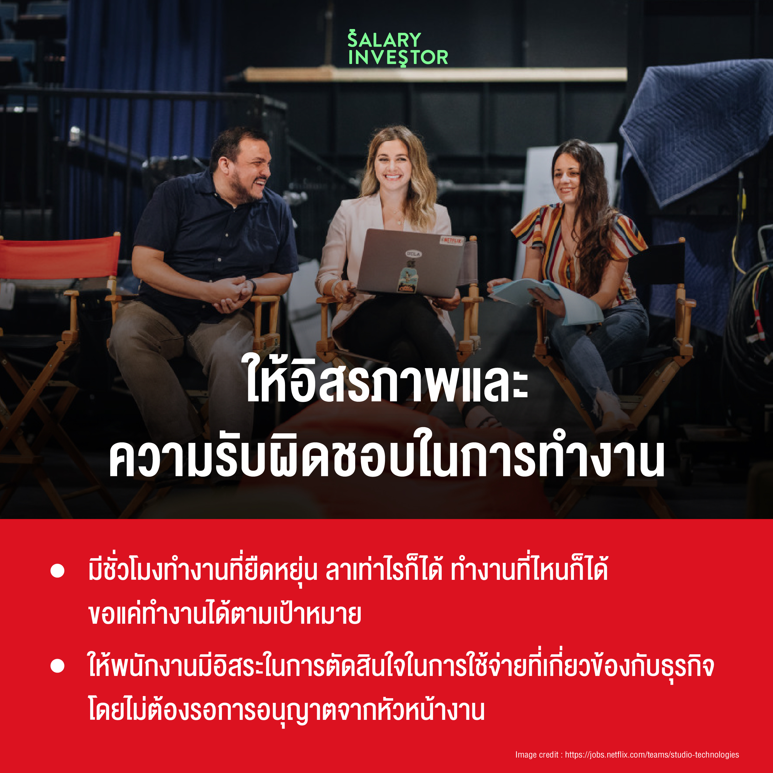 Netflix มีชั่วโมงการทำงาน ที่ยืดหยุ่น พนักงานจะมีวันลา เท่าไรก็ได้ ทำงานจากที่ไหนก็ได้ ตราบเท่าที่พวกเขาสามารถทำงานได้ตามเป้าหมาย