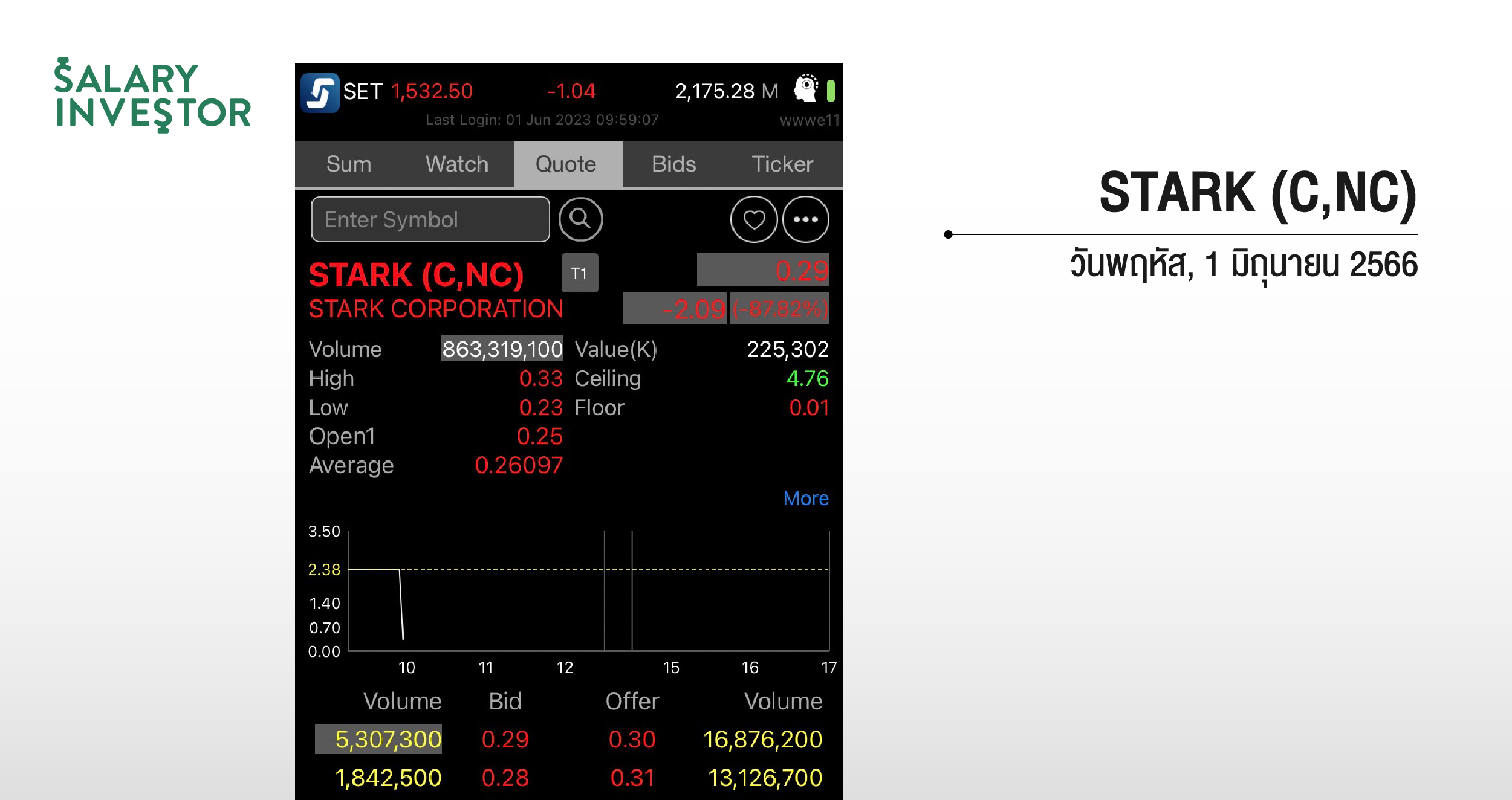 ทำให้มีการหยุดการซื้อขายไปตั้งแต่ เดือนมีนาคม 2566 สาเหตุจากไม่สามารถส่งงบการเงินได้ และกลับมาซื้อใหม่เมื่อมิถุนายน 2566 ราคาหุ้นปรับตัวลงมากกว่า 90% หลังจากเปิดการซื้อขายในช่วงที่ผ่านมา จากมูลค่ากิจการที่เคยทำจุดสูงสุดอยู่ที่ 89,000 ล้านบาท ราคาหุ้น เคยทำจุดสูงสุดที 6.65 ราคา เมื่อ (21 ม.ค. 2562) แต่ล่าสุด มูลค่ากิจการของ STARK เหลือเพียง 2,950 ล้านบาท (ราคาหุ้น 2 มิ.ย.2566 อยู่ที่ 0.22 บาท)