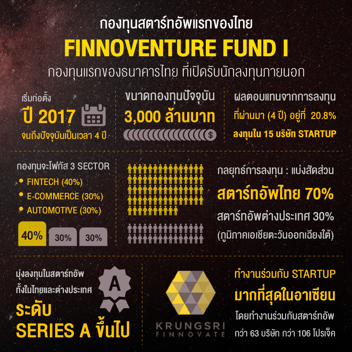 เพื่อเปิดโอกาสให้นักลงทุนสถาบัน และนักลงทุนรายใหญ่ (Ultra High Net Worth) และองค์กรที่สนใจการลงทุนในสตาร์ทอัพ สามารถเข้ามาร่วมลงทุนได้ โดยมี Krungsri Finnovate เป็นผู้ดูแล
