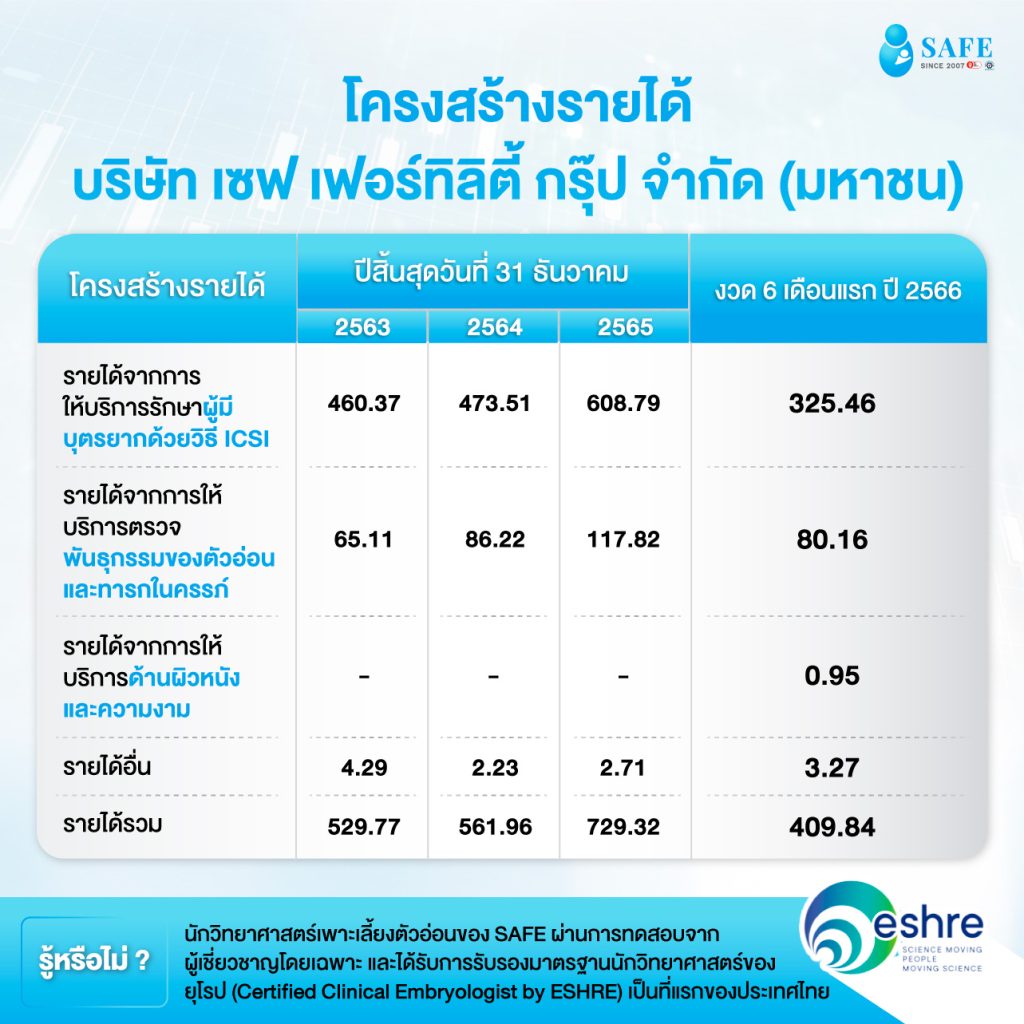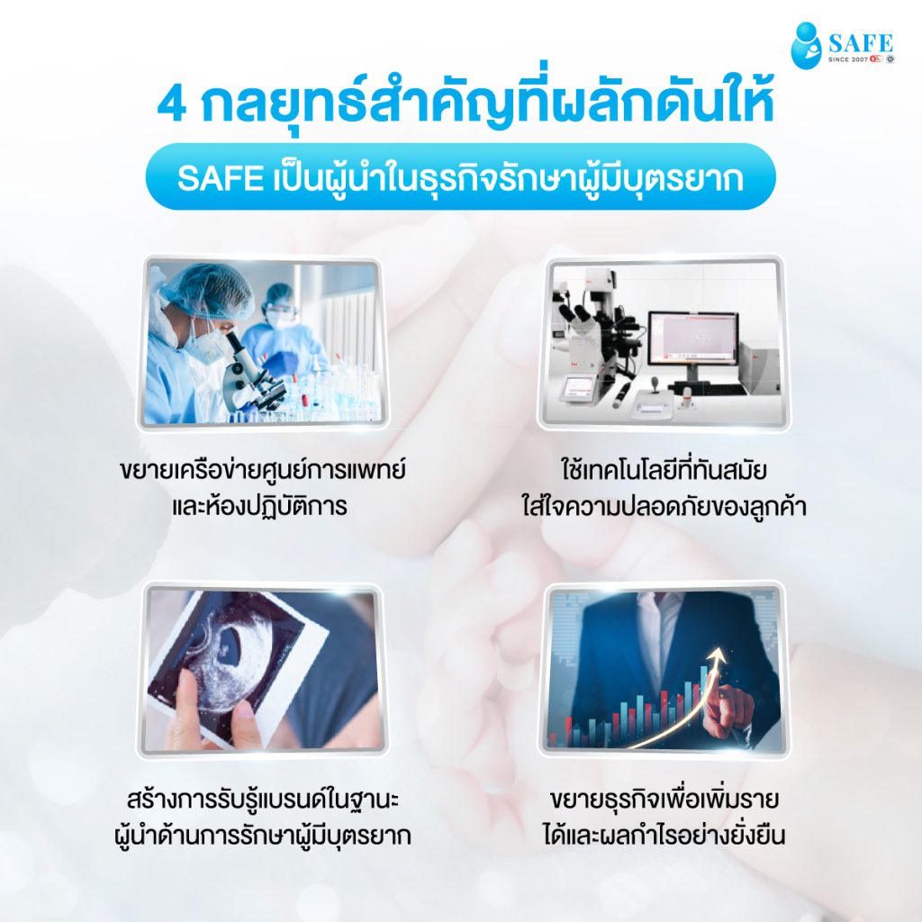 Trend Business ถอดรหัส SAFE ความสำเร็จที่สะท้อนโอกาสในวิกฤตของธุรกิจรักษาผู้มีบุตรยาก TrendBusinessGuideInvestment ถอดรหัส SAFE ความสำเร็จที่สะท้อนโอกาสในวิกฤตของธุรกิจรักษาผู้มีบุตรยาก By Salary Investor - Oct 16, 2023 นอกจากการฟื้นฟูเศรษฐกิจยุคหลังโควิด-19 แล้ว อีกปัญหาหนึ่งที่ทั่วโลกต่างกังวลไม่แพ้กันคือ ปัญหาจำนวนประชากรวัยทำงานที่ลดน้อยลง อันเนื่องมาจากอัตราการเจริญพันธุ์ต่ำ โดยองค์การอนามัยโลก (WHO) ประมาณการว่า 15% ของคู่สมรสทั่วโลกประสบภาวะมีบุตรยาก อัตราการเจริญพันธุ์ในประเทศไทยเองก็ลดลงเช่นกัน จากจำนวนบุตร 5.5 คน ต่อผู้หญิง 1 คน ในปี พ.ศ. 2513 เหลือเพียงจำนวนบุตร 1.16 คน ต่อผู้หญิง 1 คน ใน ปี พ.ศ. 2564 รวมถึงอายุเฉลี่ยในการมีบุตรของผู้หญิงก็มีแนวโน้มสูงขึ้นด้วย จากปัญหาดังกล่าว ทำให้เกิดโอกาสทางธุรกิจที่น่าสนใจขึ้นมา นั่นคือ ธุรกิจศูนย์การแพทย์เฉพาะทางเพื่อการมีบุตร ที่คอยให้คำปรึกษาและเสนอบริการทางการแพทย์ สำหรับผู้ที่ต้องการมีบุตร หรือมีบุตรยากจากสาเหตุต่าง ๆ ซึ่งธุรกิจนี้ยังทำให้เกิดการเดินทางข้ามประเทศของกลุ่มนักท่องเที่ยวที่ต้องการรักษาการมีบุตรยากโดยเฉพาะ หรือ fertility tourism อีกด้วย มีการคาดการณ์ว่าตลาด fertility tourism ทั่วโลกจะมีมูลค่ากว่า 1.8 แสนล้านบาทในปี 2569 เติบโตเฉลี่ยร้อยละ 15.2 ต่อปี ซึ่งภูมิภาคเอเชียแปซิฟิกเป็นตลาดที่มีมูลค่าและการเติบโตสูงที่สุด สำหรับเมืองไทย คือหนึ่งในจุดหมายปลายทางสำคัญของธุรกิจ fertility tourism โดยบริษัทที่โดดเด่น คือ บริษัท เซฟ เฟอร์ทิลิตี้ กรุ๊ป จำกัด (มหาชน) หรือ SAFE ผู้ให้บริการศูนย์การแพทย์เพื่อการมีบุตรแบบครบวงจร ภายใต้ชื่อ “ศูนย์การแพทย์เพื่อการมีบุตร เซฟ เฟอร์ทิลิตี้ เซ็นเตอร์” ที่ได้รับการรับรองมาตรฐานคลินิกเด็กหลอดแก้วแห่งแรกในประเทศไทย และแห่งที่สองในเอเชีย ที่มีผู้ดูแลส่วนบุคคลที่สามารถสื่อสารได้หลายภาษา SAFE ก่อตั้งขึ้นในปี 2552 โดยนายแพทย์วิวัฒน์ กว้างคณานุรักษ์ และครอบครัว จากความตั้งใจที่จะนำความรู้และประสบการณ์กว่า 22 ปี ในด้านการรักษาผู้มีบุตรยาก มาช่วยเหลือผู้ที่ต้องการมีบุตร เพื่อเติมเต็มความฝันในการมีบุตรได้จริงแก่ทุกครอบครัว SAFE ได้นำเข้าเครื่องมือทางการแพทย์ที่มีประสิทธิภาพและใช้เทคโนโลยีอันทันสมัยจากต่างประเทศ มาให้บริการแก่ลูกค้าอย่างต่อเนื่อง ไม่ว่าจะเป็น ปี 2555 นำเข้าตู้เลี้ยงดูตัวอ่อนรุ่นใหม่ (Embryoscope) มาใช้เป็นที่แรกในประเทศไทย ปี 2557 นำเทคโนโลยีคัดกรองโครโมโซมด้วยเทคนิค Illumina NGS (PGT-A) มาใช้แห่งแรกในประเทศไทย ปี 2558 ผ่านการรับรองมาตรฐานคลินิกเด็กหลอดแก้วจากสถาบัน RTAC แห่งแรกในประเทศไทยและแห่งที่ 2 ในเอเชี